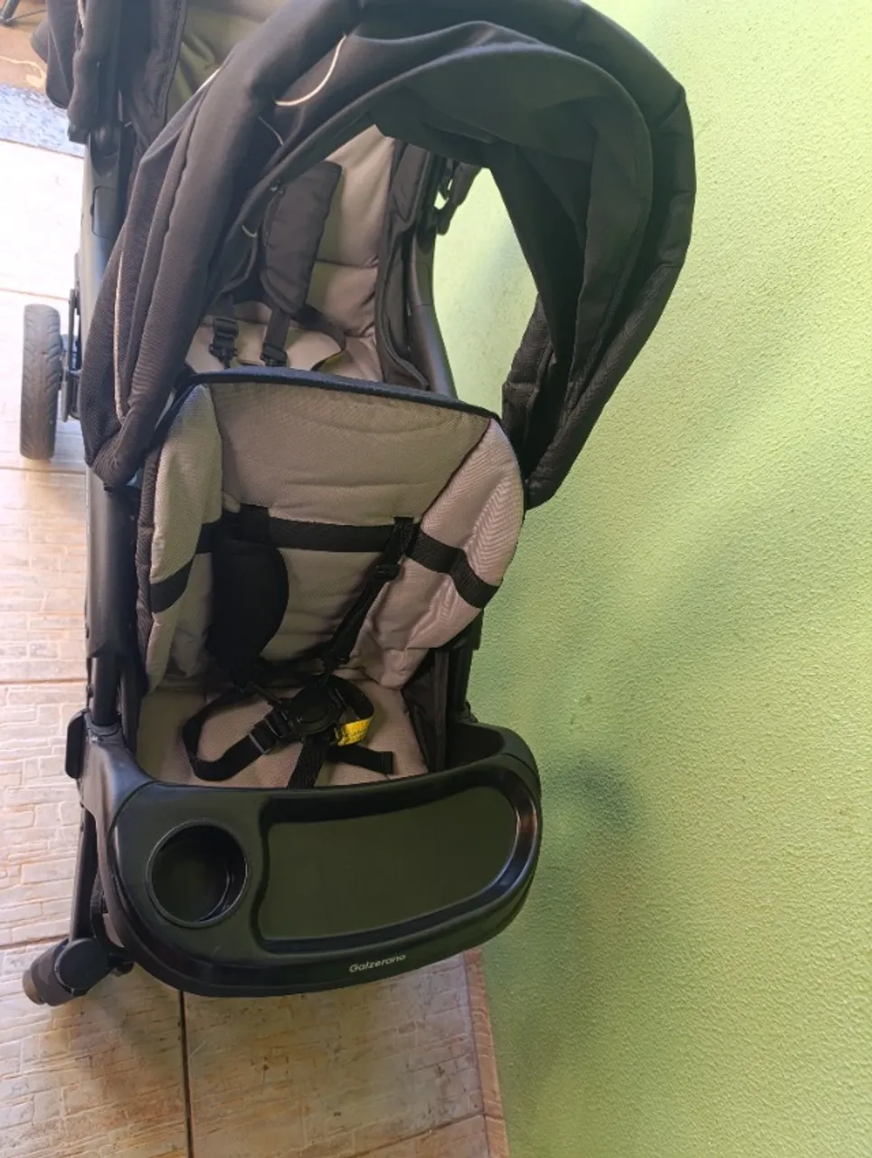 Carrinho de bebê para gêmeos, ou irmãos, ideal para passeios com conforto e segurança. Ele é desmontável para ir ao porta-malas. Marca Galzerano.