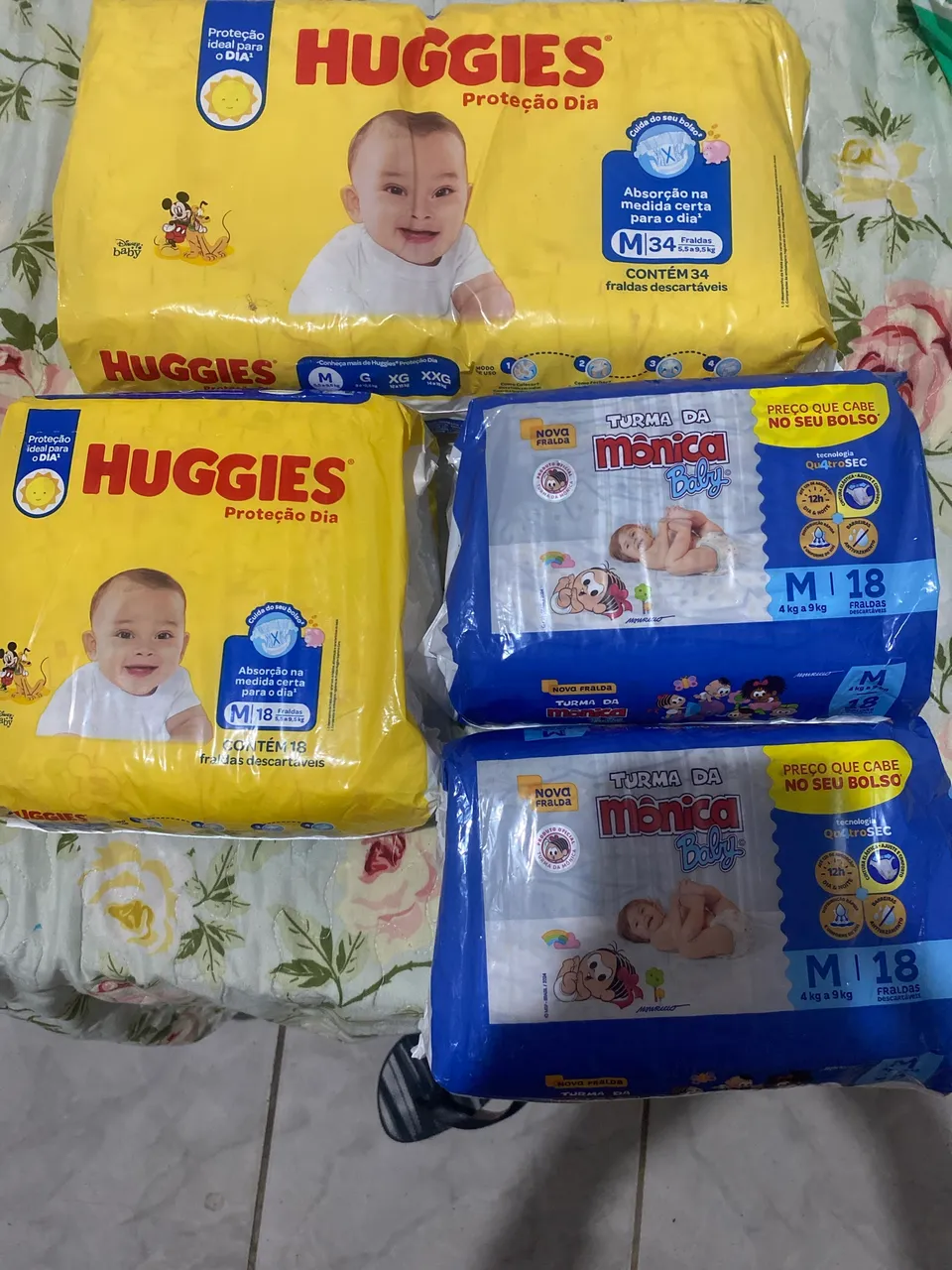 Huggies M 34 unid R$34,00 Huggies M 18 unid R$18,00 Turma da Mônica 18 unid R$18,00 cada