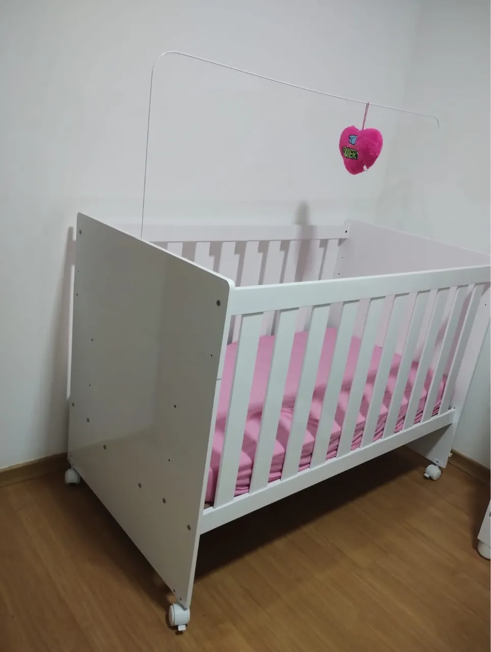 Lindo berço branco com detalhes em rosa, perfeito para o quarto do seu bebê! Design moderno e seguro para o conforto do seu pequeno.