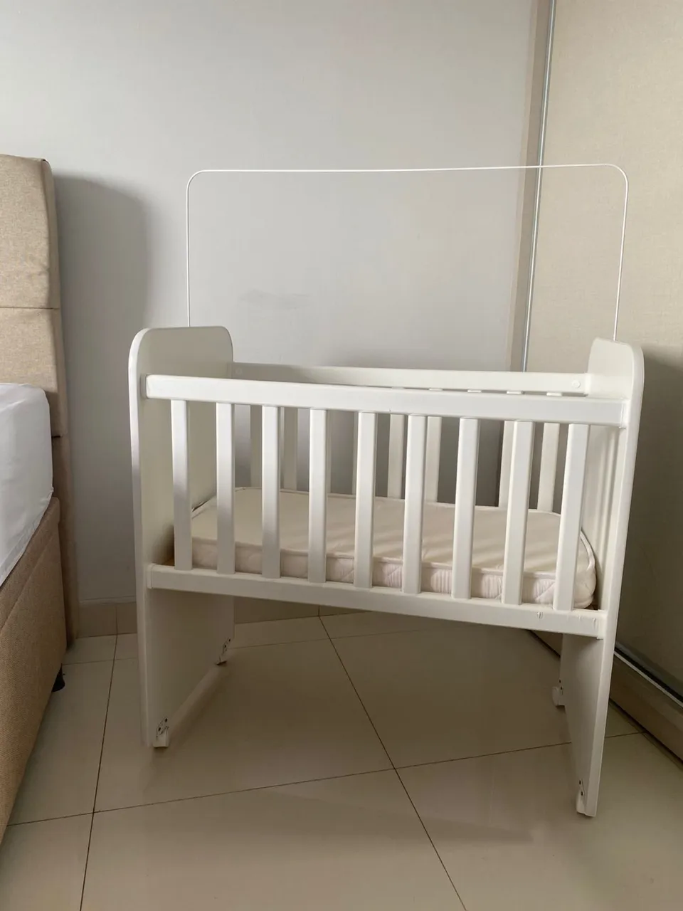 Mini berço com colchão, varão de mosquiteiro removível, rodinhas c/ travas