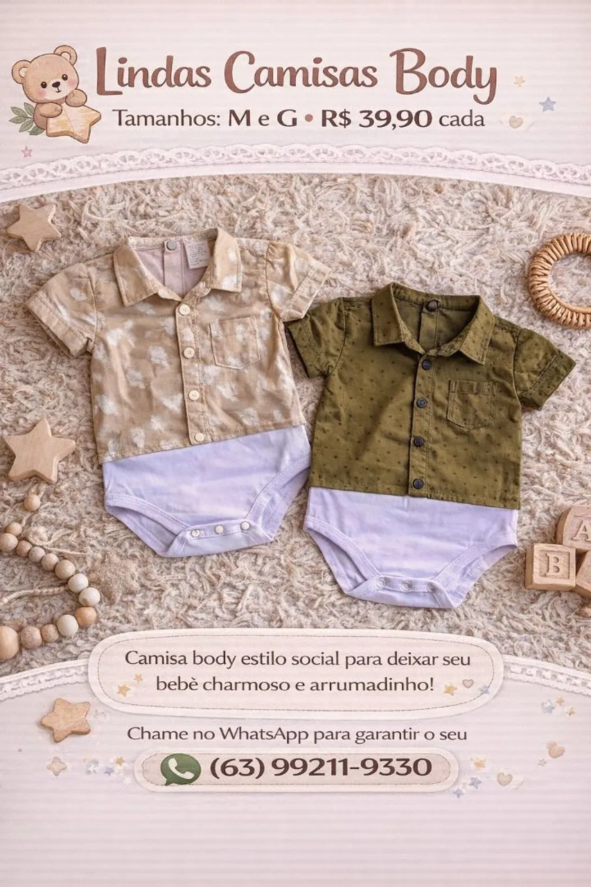 Lindas camisas body, perfeitas para deixar seu bebê charmoso e estiloso! Confeccionadas com tecido de alta qualidade, garantindo conforto e durabilidade. Disponíveis nos tamanhos M e G. Chame no WhatsApp e garanta a sua!