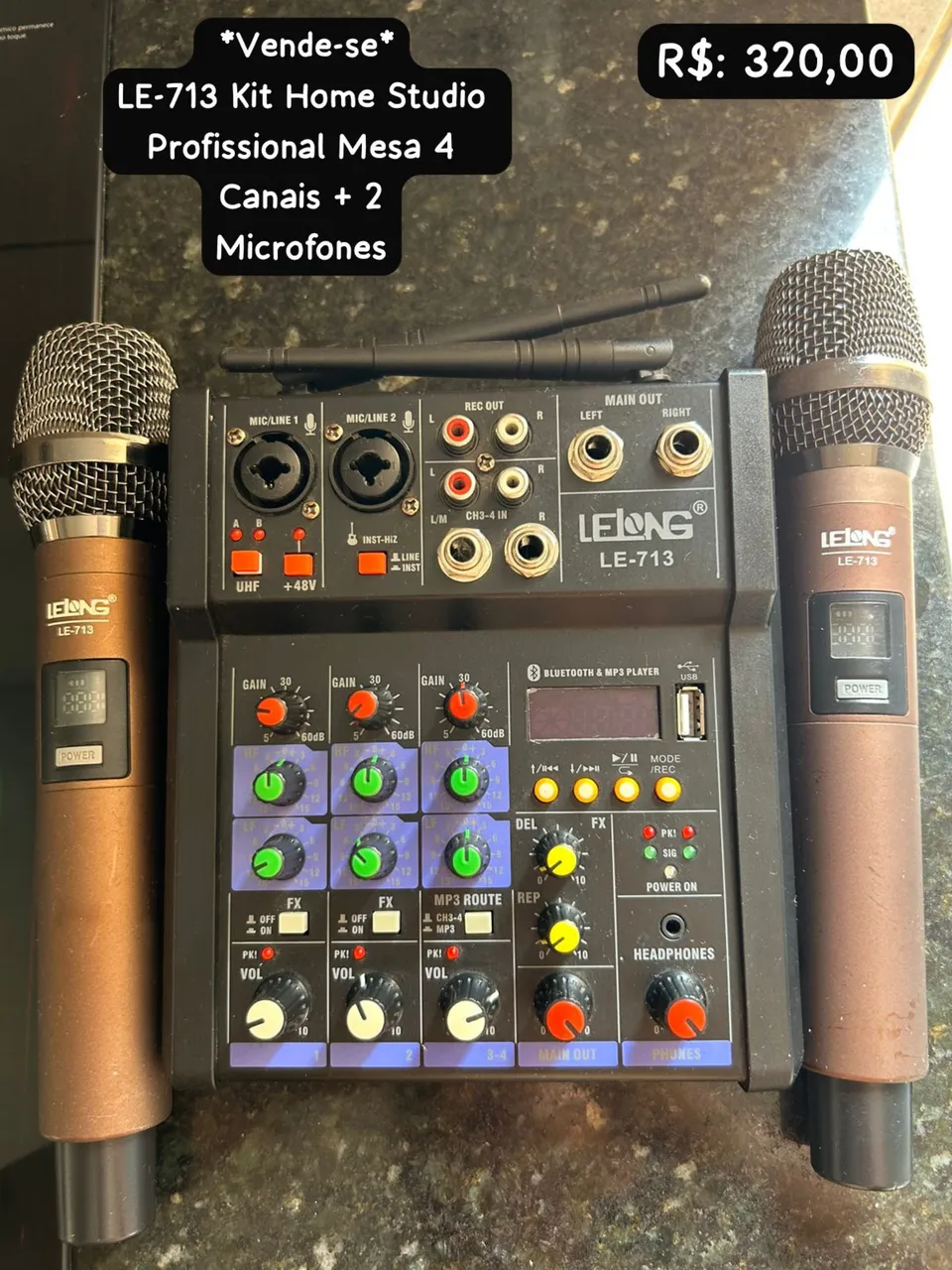 Transforme suas gravações com o Kit Home Studio LE-713! Esta mesa de som profissional de 4 canais, acompanhada de 2 microfones, oferece tudo o que você precisa para áudio de alta qualidade. Ideal para quem busca versatilidade e resultados incríveis.