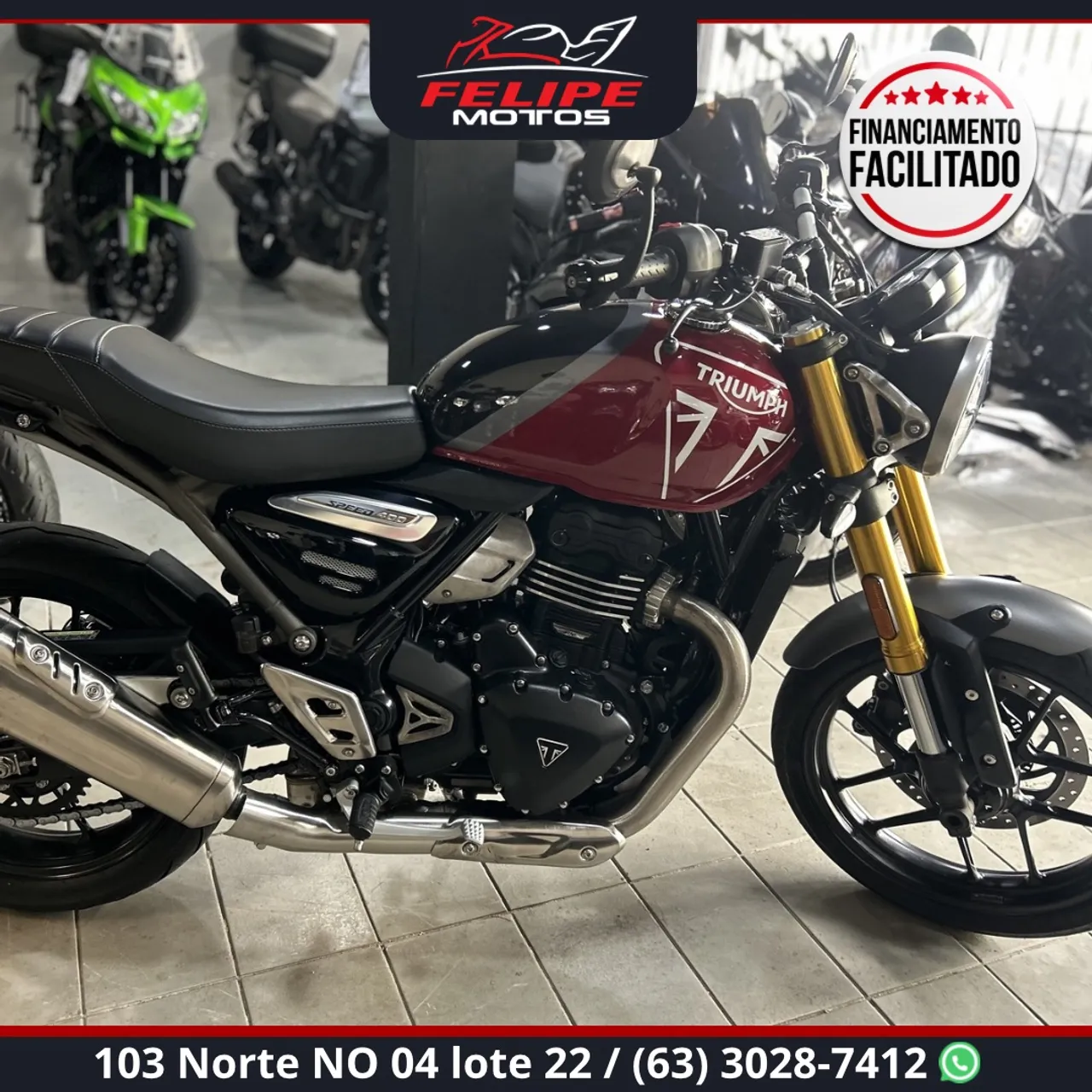 Observação: TRIUMPH SPEED 400, único dono, pneus seminovos, revisões periódicas em dias, freios a disco duplo, ABS de dois canais, controle de tração, suspensão traseira Monoshock, painel semidigital com LCD, iluminação FULL LED, tomada USB-C , sistema de acelerador eletrônico. Ideal para quem busca estilo, segurança e desempenho equilibrado para o dia a dia.