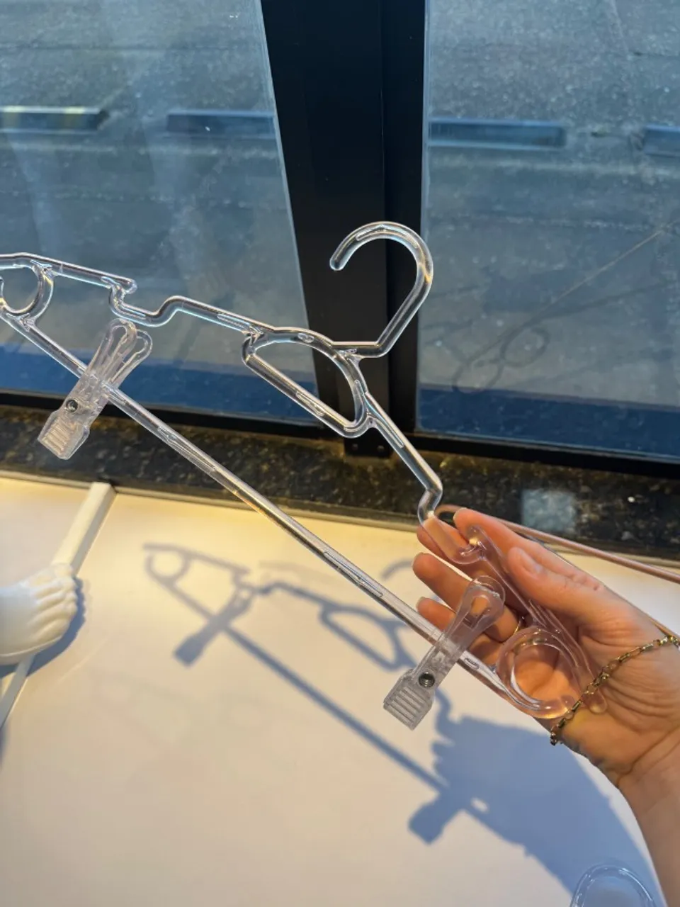 Cabide transparente com presilhas, ideal para organizar suas roupas com praticidade e estilo. Design moderno e funcional para otimizar o espaço do seu guarda-roupa ou loja.