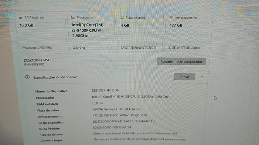 Computador com processador Intel Core i5-9400F, SSD NVME de 480GB, com dual memória 8 GB DDR4 TEAMGROUP-UD4-2666 - 2400/2400, Placa de Vídeo Nvídia Geforce GTX 550 de 4Gb DDR5, com controladora de Fan, com teclado e mouse, com Monitor Samsung Curvo de 27 Polegadas, ideal para rodar seus jogos favoritos com desempenho excepcional.