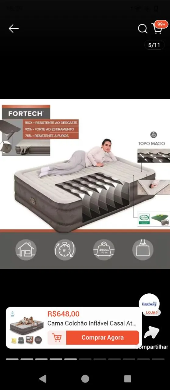 Colchão inflável casal Fortech, da ,Marca Bestway,resistente ao desgaste, forte ao estiramento e resistente a furos. Possui topo macio para maior conforto, enchimento automático bivolt
