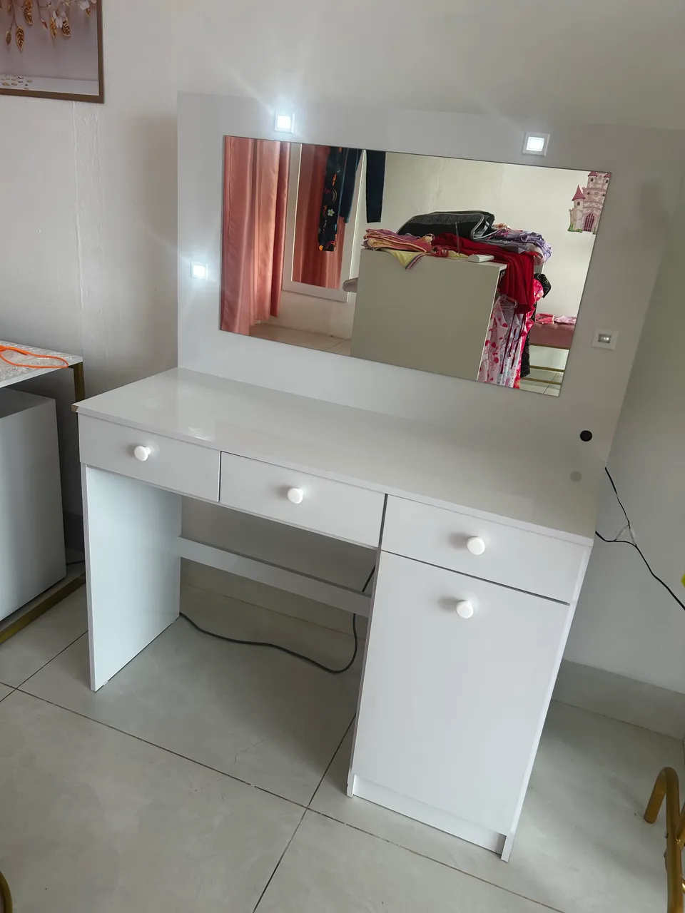 Linda penteadeira com design moderno e elegante. Ideal para organizar seus cosméticos e acessórios. Possui gavetas espaçosas e espelho com iluminação, perfeita para criar um espaço de beleza funcional e charmoso.