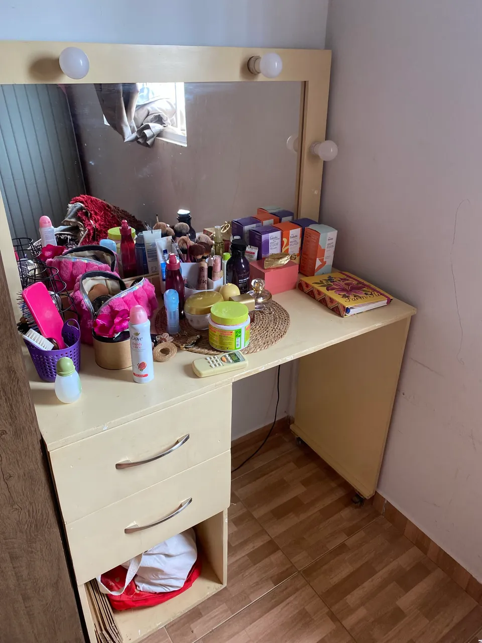 Linda penteadeira com design elegante e funcional, ideal para organizar seus cosméticos e maquiagens. Possui espelho com iluminação, gavetas espaçosas e um visual que valoriza qualquer ambiente.