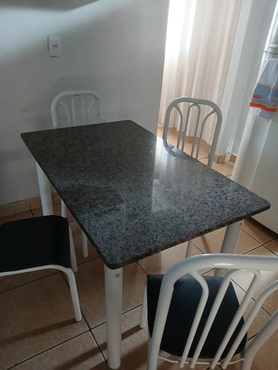 Linda mesa de mármore com 4 cadeiras brancas, perfeita para sua cozinha ou sala de jantar. Design moderno e elegante, ideal para reunir a família e amigos.