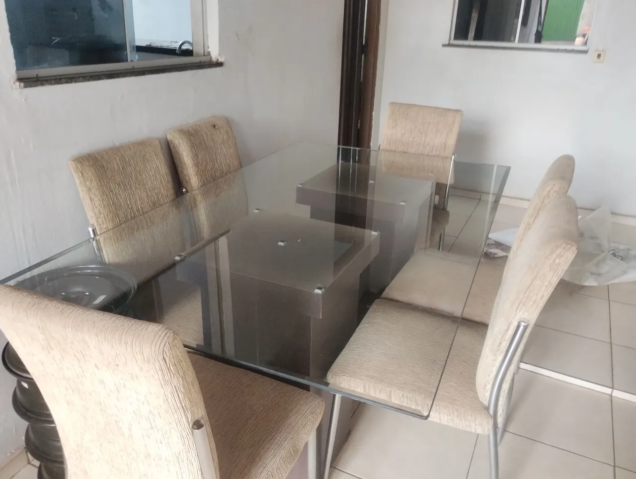 Mesa de jantar para 6 pessoas, para reunir a família e amigos. Design em vidro e madeira