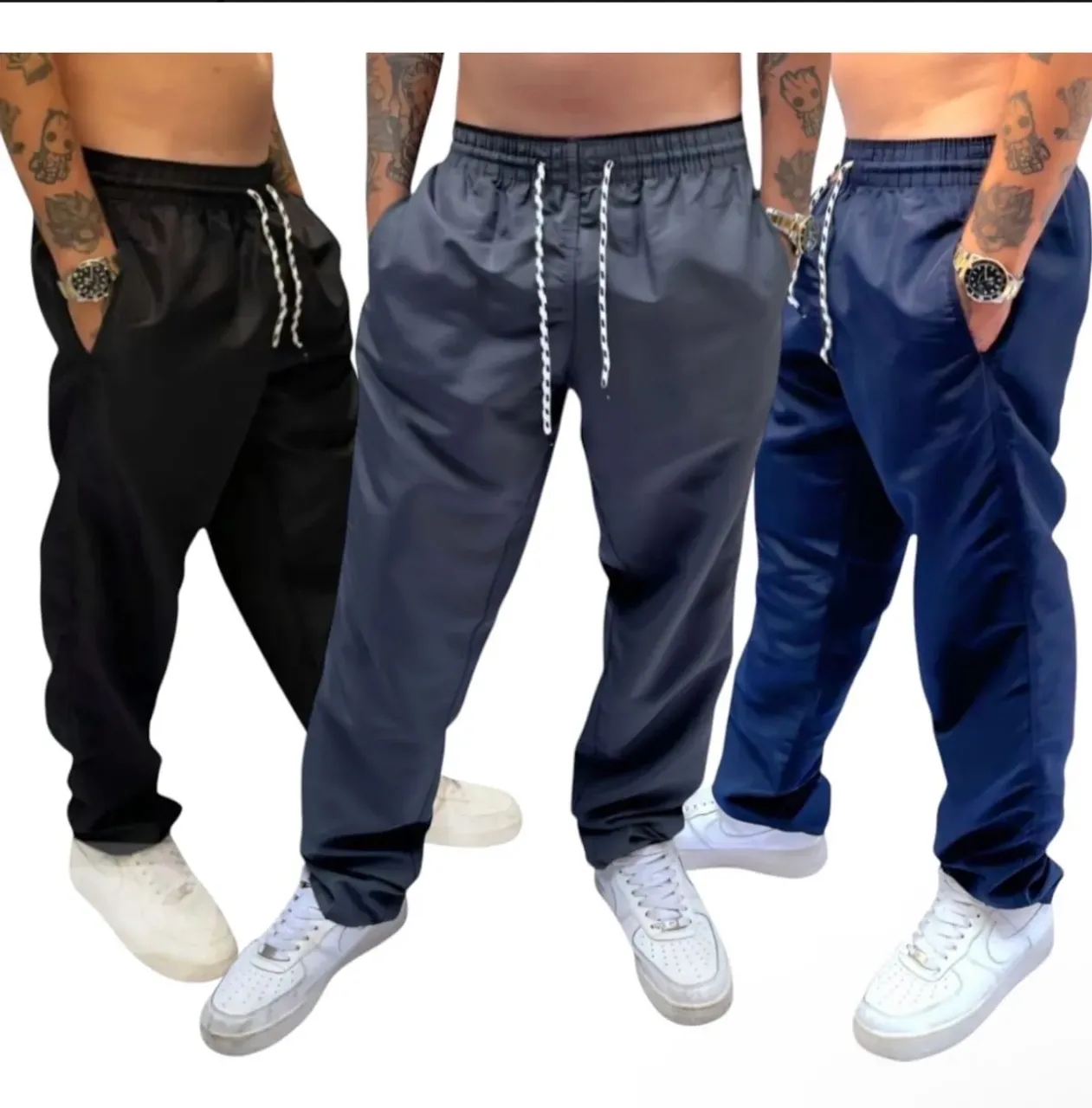 CALÇAS TACTEL MASCULINA PRETA/AZUL/ CINZA 3 BOLSOS E CORDÃO DE AMARRAR