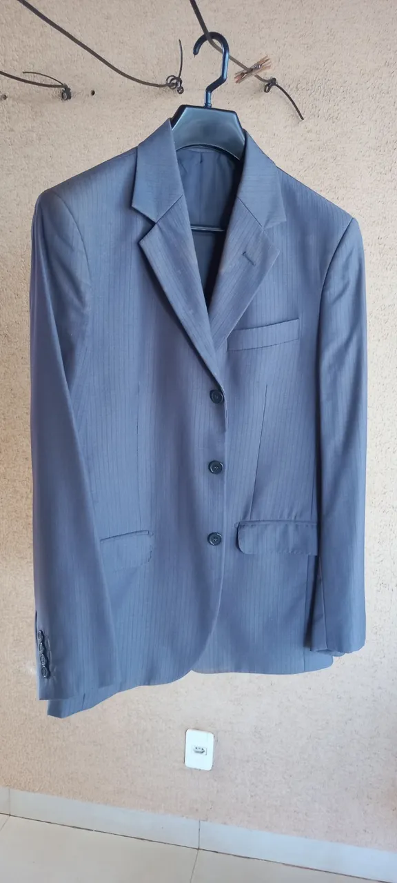 Terno cinza Fazzolin, único dono, usado apenas 2x. Minhas medidas 1,76m, 73Kg (na época). Motivo da venda: está muito tempo guardado e estou mais pesado agora, não serve mais. Obs: tem umas manchas laranjas devido ao tempo guardado, acredito que depois de lavar saia com facilidade. Acompanha calça, tamanho 40.